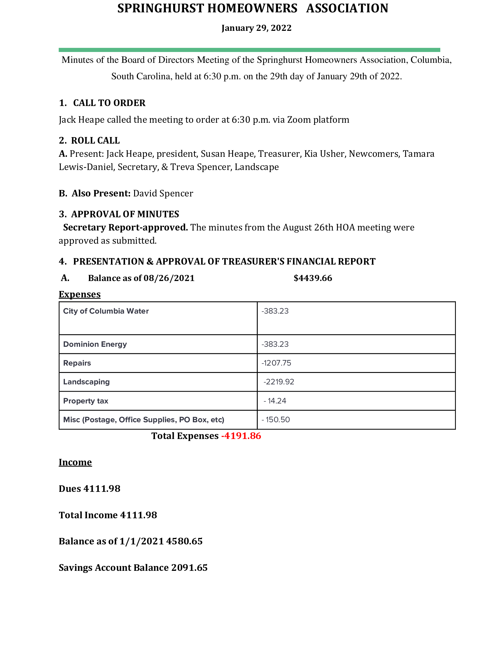- Present: Jack Heape, president, Tamara Lewis-Daniel, Secretary, & Treva Spencer, Landscape, & Susan Heape, Treasurer